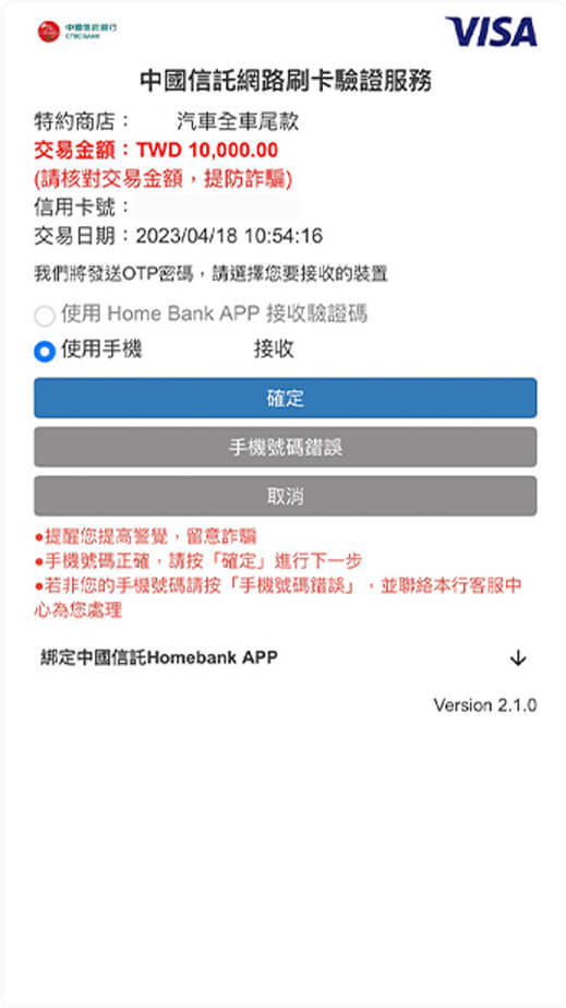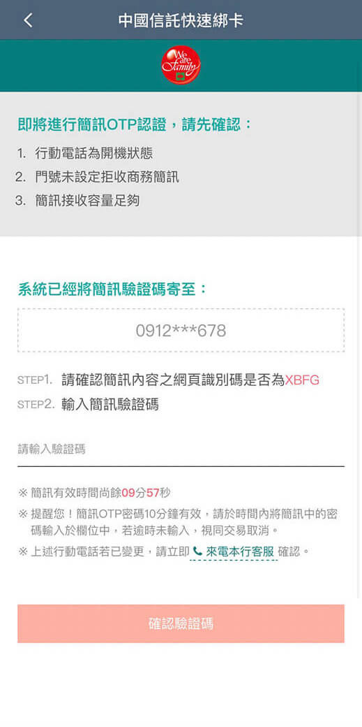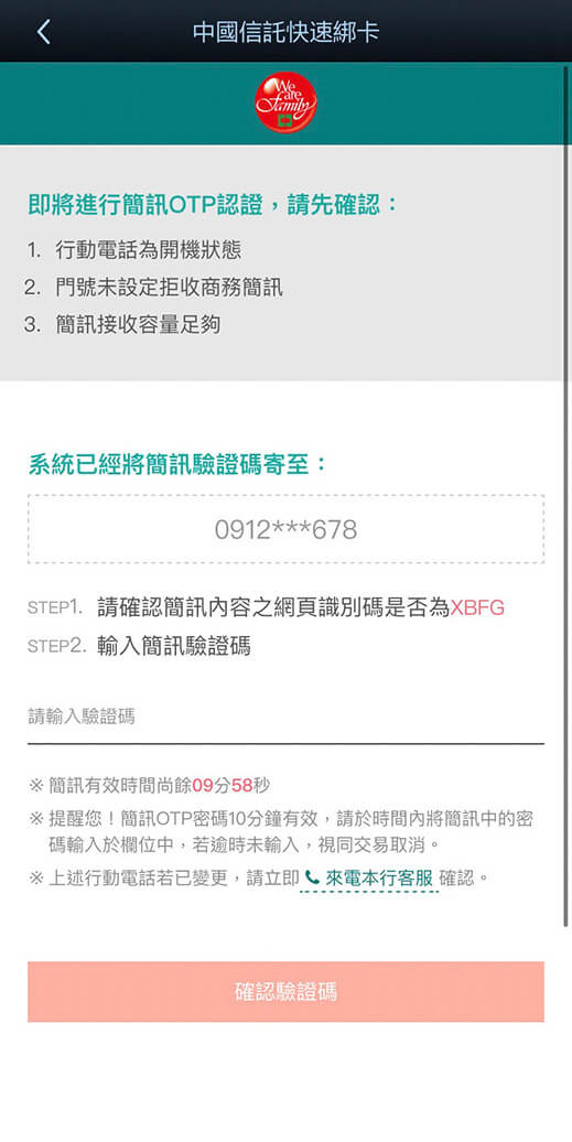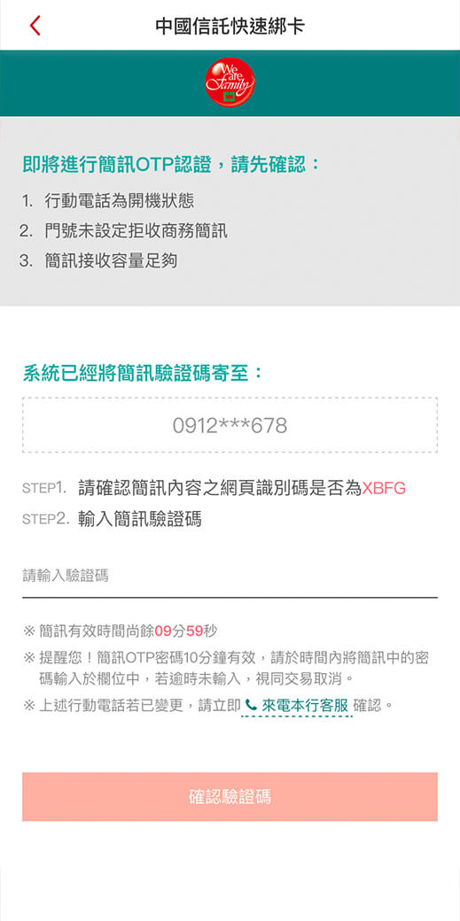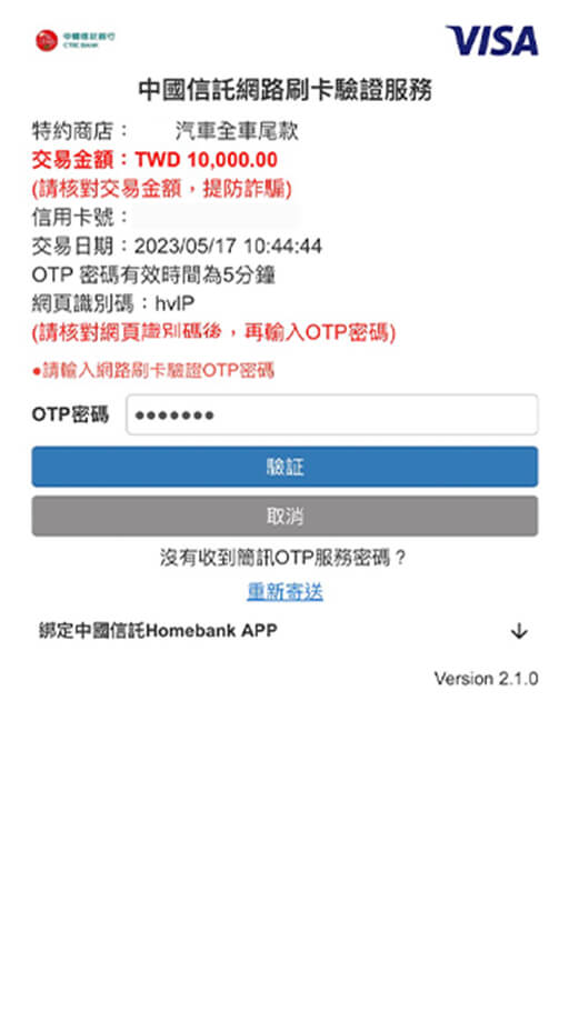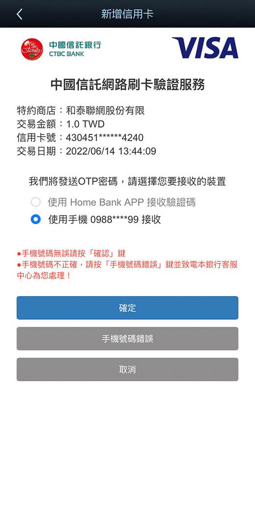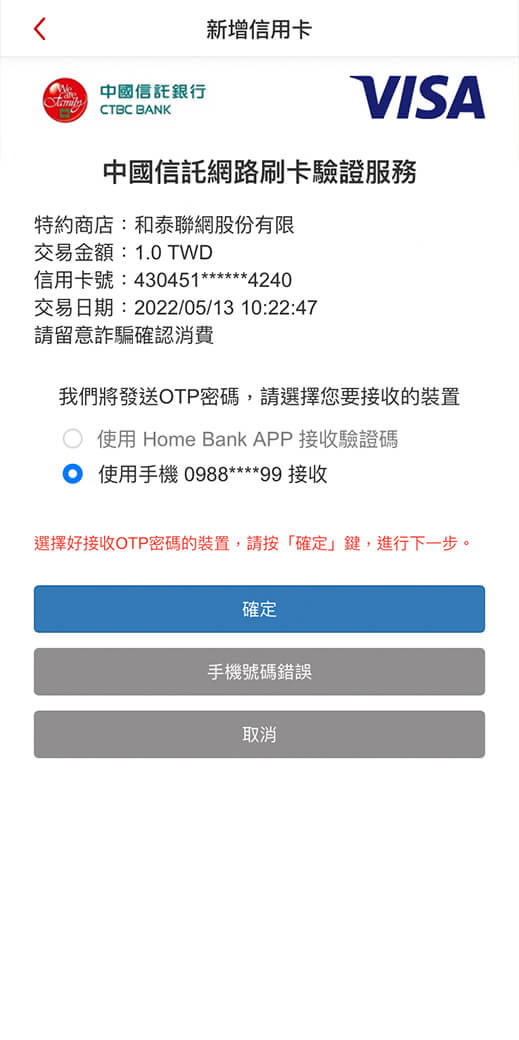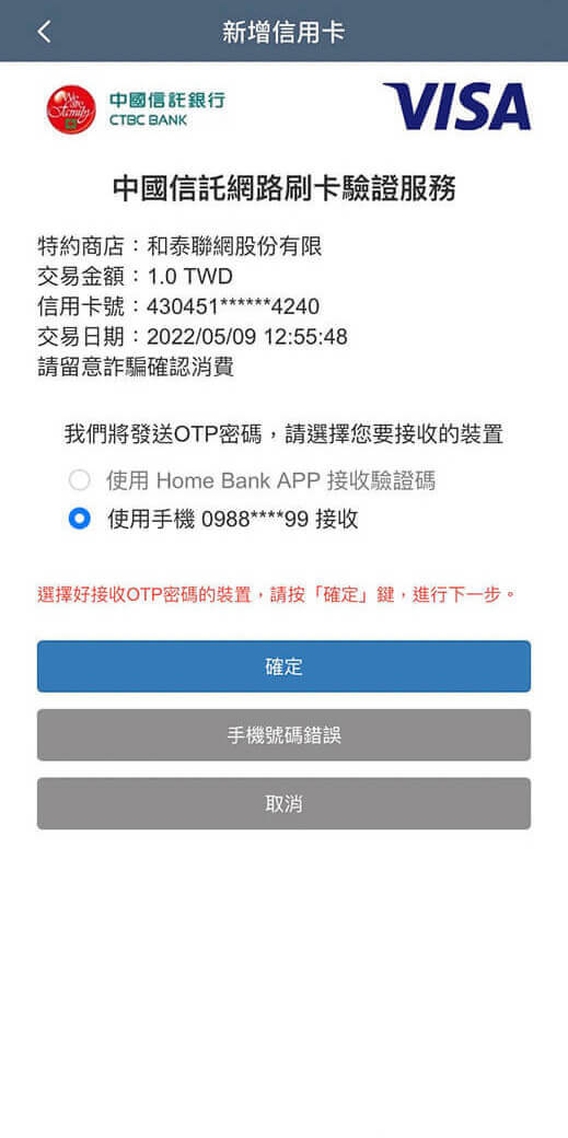 完成簡訊OTP驗證(將進行一筆1元的測試交易,不會實際扣款,請放心執行)