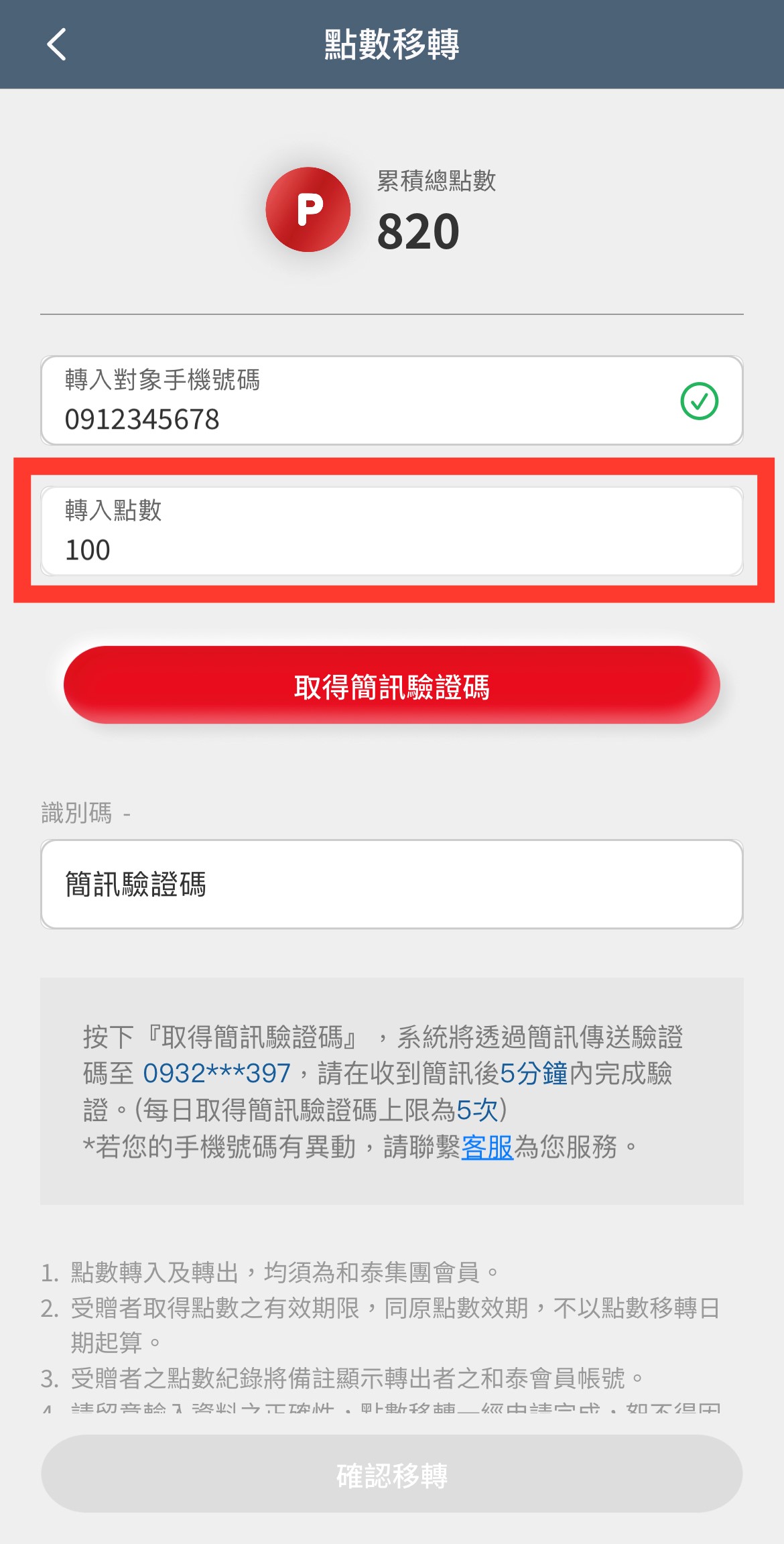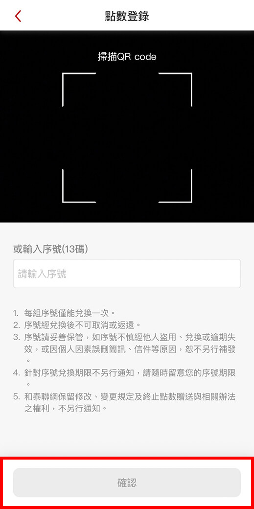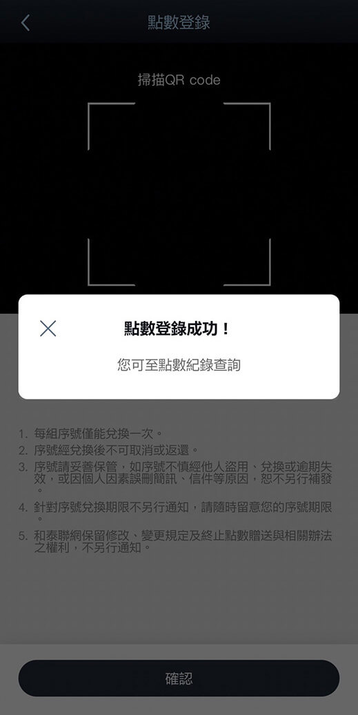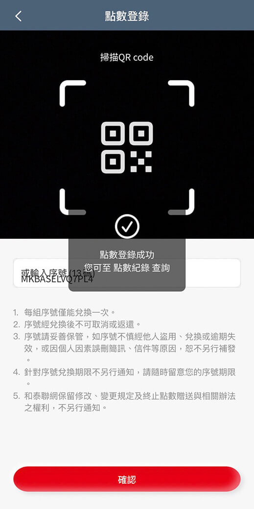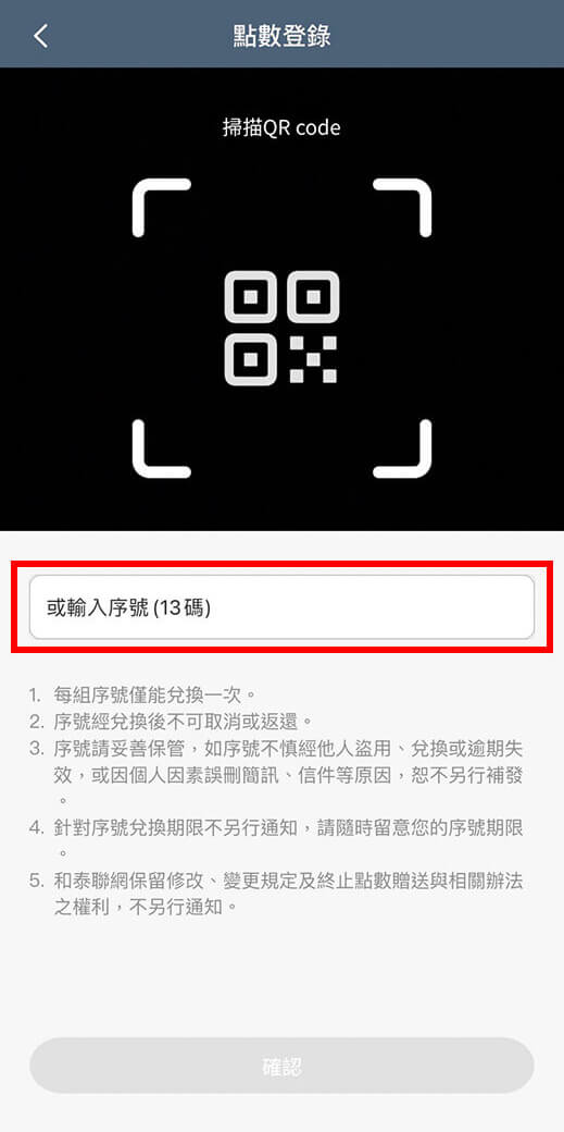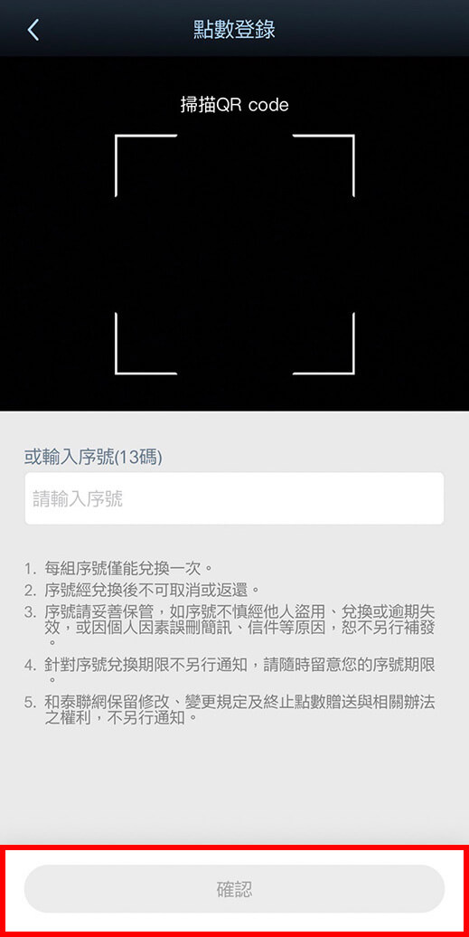 以相機掃描點數序號條碼或輸入點數序號後,點選確認